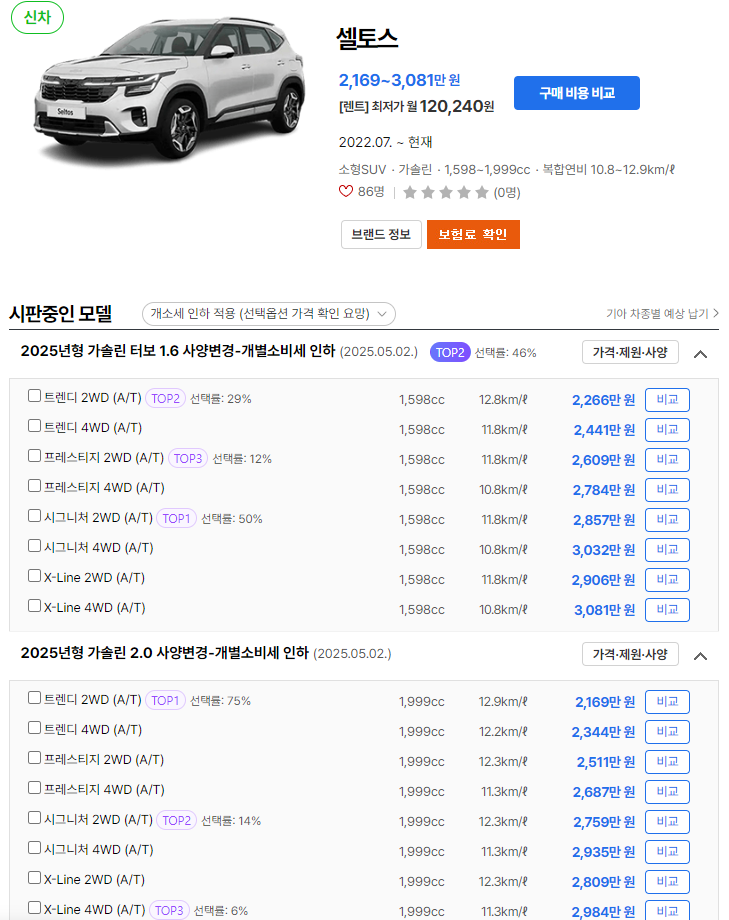 2025 셀토스의 가격은 트림과 옵션에 따라 달라집니다: