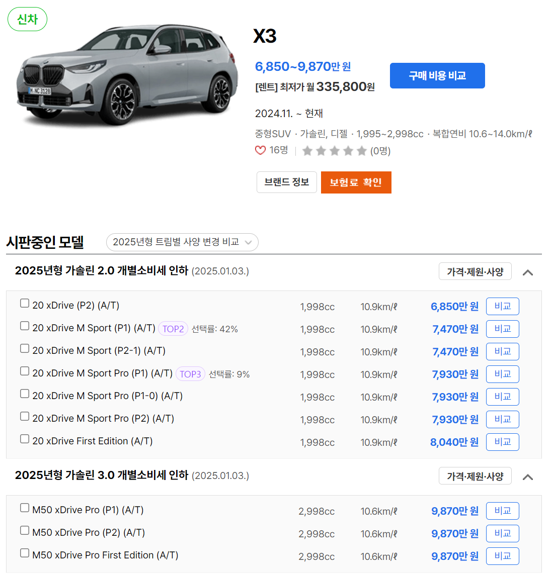 2025 BMW X3는 가격, 연비, 제원, 유지비 측면에서 모두 뛰어난 선택이 될 수 있습니다. 해당 차량 구매에 고민 중이시라면 위 정보를 참고해보시길 바랍니다.